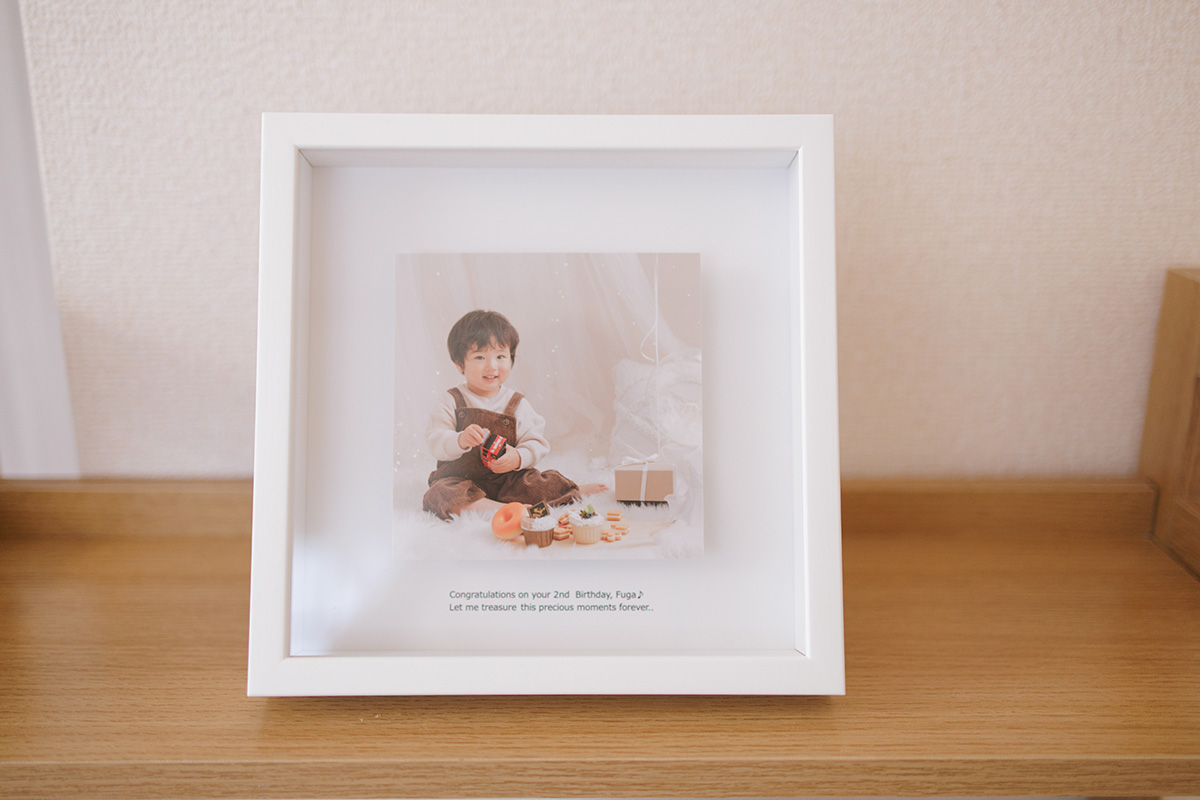 真っ白なボックスフレームにお気に入りのお写真とお名前やメッセージを添えて。インテリアのアクセントになるおしゃれなパネルです。