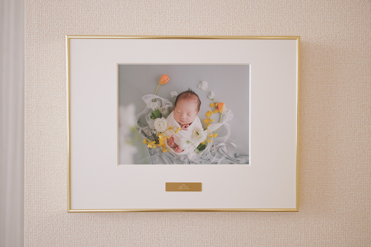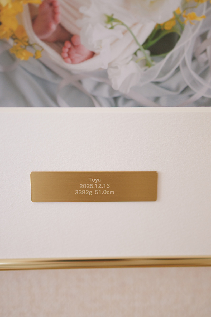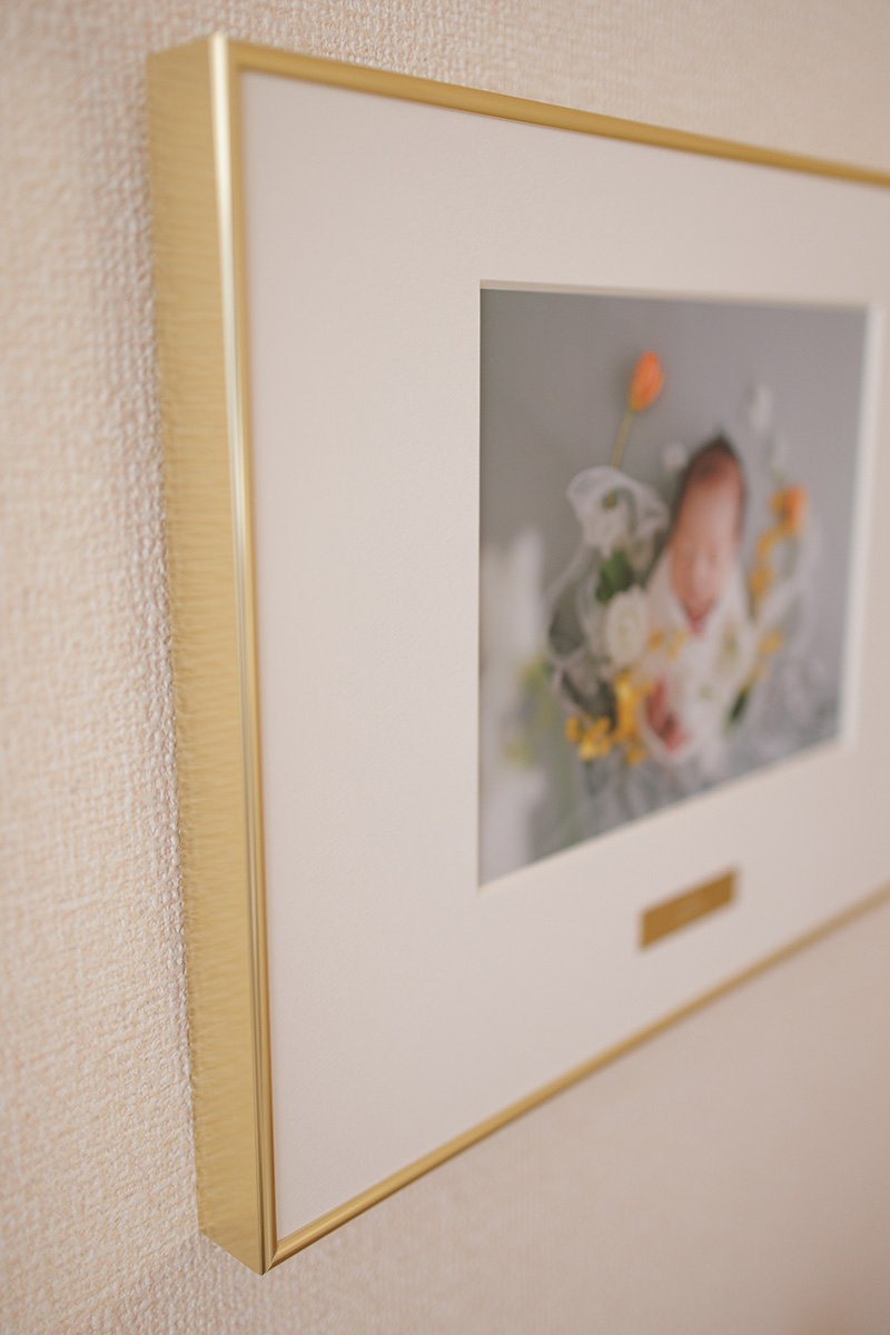 美術館に展示されているかのような洗練されたゴールドフレームパネル。金属製のプレートにはお名前や誕生日などを入れられるお子さまオリジナルのパネルです。